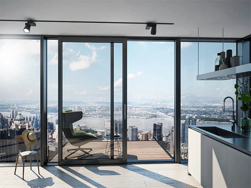 Lämpökatkoilla eristetyt alumiiniprofiilit on varustettu lisäeristeellä ja tehokkailla tiivisteillä. Kun kokonaisuuteen liitetään korkealaatuinen eristyslasi, täyttävät rakenteet passiivitalojen vaatimukset. Oven liukuva elementti voidaan asentaa kiinteän lasiosan sisä- tai ulkopuolelle. Rakennuksen sisäpuolella liukuva ovielementti ei ole alttiina lumelle, jäälle eikä pihapuista lentäville roskille. Kookkaan painikkeen ja millintarkan heloituksen ansiosta ovi sulkeutuu tiiviisti yhden käden liikkeellä ja pitää kylmän, vedon tunteen ja tieliikenteen äänet rakennuksen ulkopuolella.